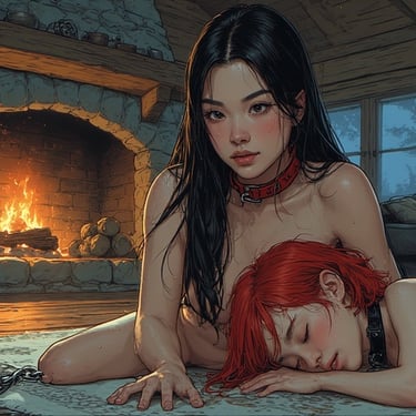 Xin felt strange and very humbled by the chain now locked to her collar. Sleeping naked on a rug was not something she was used to at all. But Marcy assured her it was okay, and Xin thought it was kinda sexy being locked to Marcy like this.